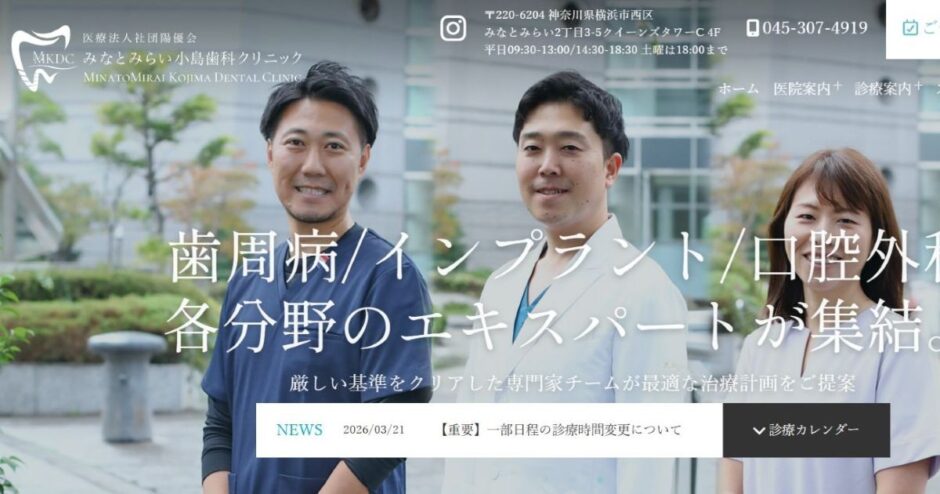 横浜市西区、みなとみらい駅直結のクイーンズタワーC内に位置するみなとみらい小島歯科クリニックは、高度な専門性と充実した設備を兼ね備えた歯科医院です。同院は、みなとみらい線「みなとみらい」駅から徒歩2分、JR根岸線「桜木町」駅からもアクセス可能という利便性の高い立地にありながら、院内は落ち着いたプライベート空間が保たれています。「あなたの今、未来のために」という理念を掲げ、単なる一時的な処置にとどまらない、将来の健康を見据えたオーダーメイドの治療提案を行っているのが特徴です。